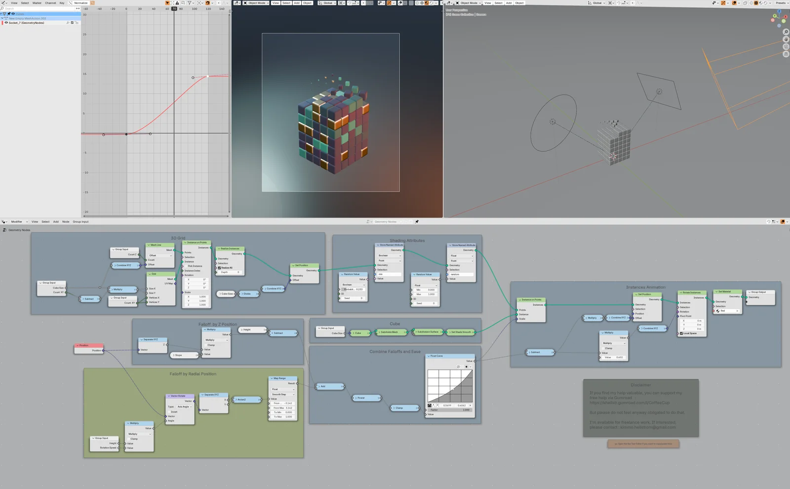 This collection provides several example files demonstrating different applications of Geometry Nodes. Included in the package are setups for instance-based block animation utilizing arctan2 scaling, a procedural scallop tile pattern generator, and an exercise in quad circle spiral topology. It also contains a node tree designed to wrap decals onto surfaces while matching normals for seamless surface blending.