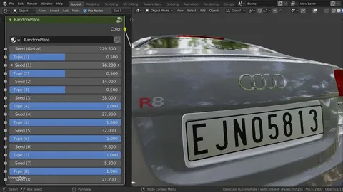 This asset automatically generates unique alphanumeric sequences for license plates. Users can configure each character slot individually, restricting it to output only digits, only letters, or a randomized combination of both. The generated characters feature displacement effects that are fully compatible with both the Cycles and EEVEE render engines.