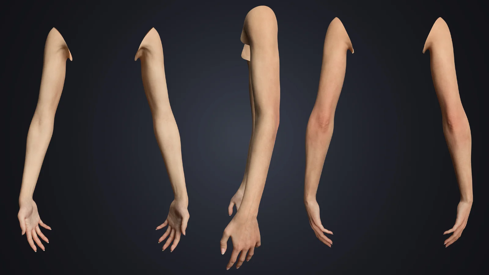 A rigged 3D model of slender female arms designed for real-time rendering in EEVEE Next. The mesh features clean, quad-based topology with 8,586 vertices and includes bone-driven shape key corrections for smooth deformation. It comes with 4K PBR textures, including baked normal maps for high-resolution anatomical detail.