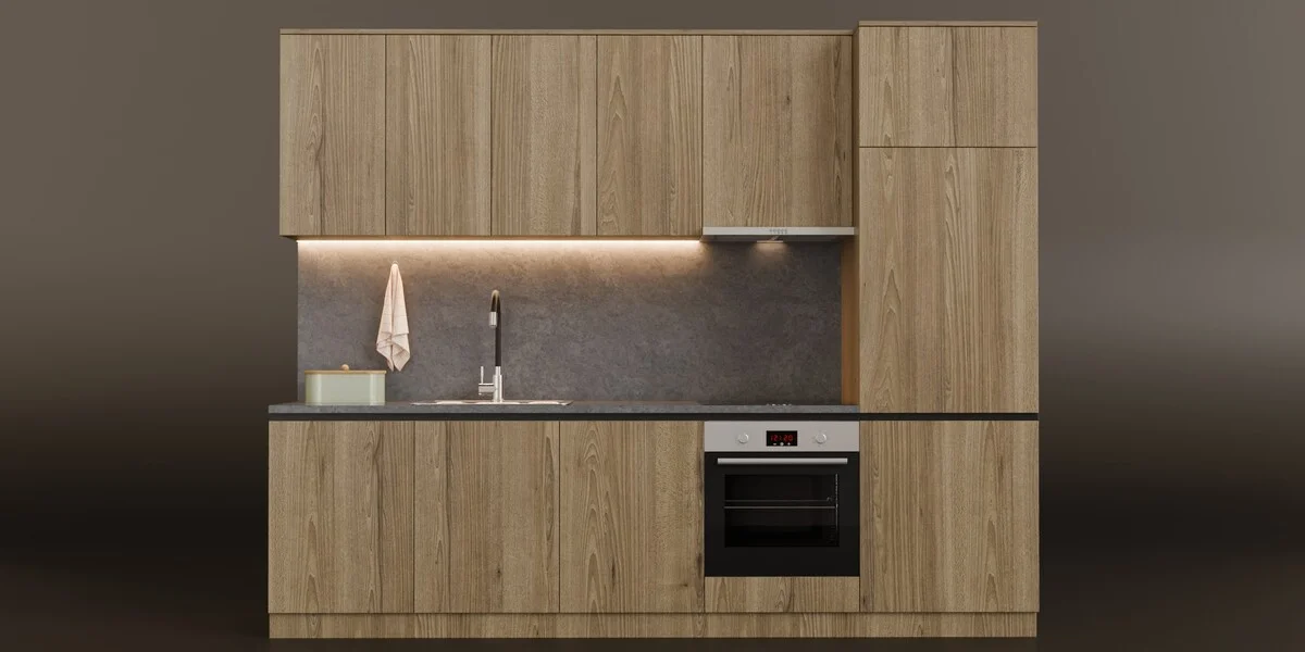 A modern wooden kitchen 3D model designed for interior visualizations and product renders. The collection includes a sink, faucet, hood, induction stove, oven, and a bread box. It features clean topology that is subdivision-ready for close-up shots and comes fully UV unwrapped.