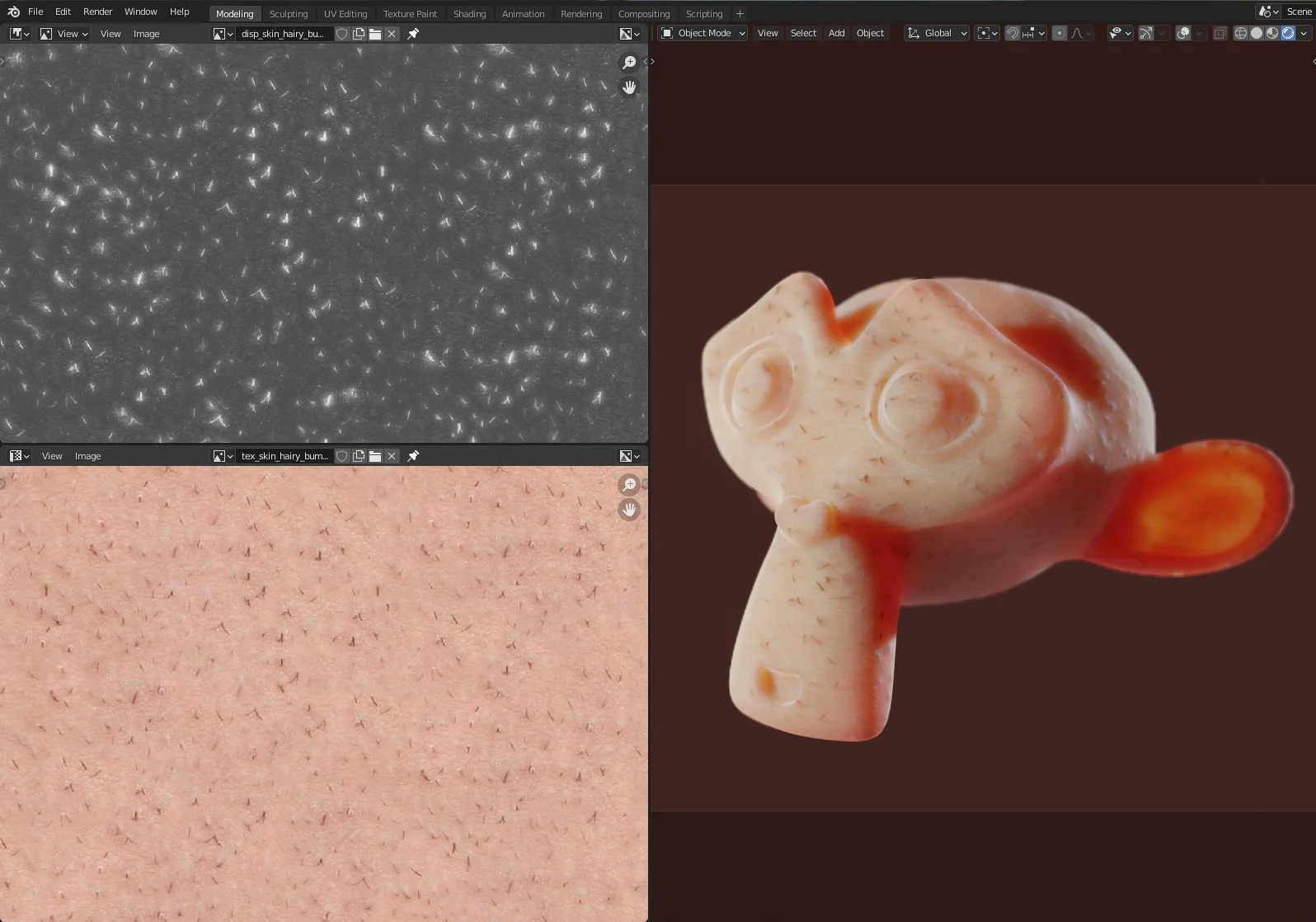 A realistic realtime skin material designed for Blender's EEVEE render engine. The shader functions without requiring UV unwrapping, making it applicable to objects straight out of the box. The included Blender project file contains the shader setup alongside example meshes. It utilizes two 1024x1024 seamless textures for color and bump mapping.