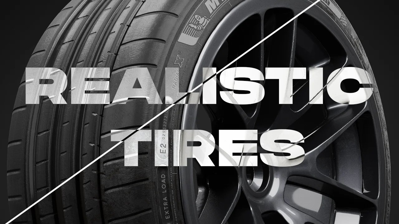 This asset provides high fidelity 3D models of tires, complete with 4K textures and a customizable sidewall system. It includes both clean and dirty texture variations, alongside a PSD file for creating custom sidewall graphics. The included Blender file features a ready-to-render scene, a rim model equipped with procedural materials, and a procedural node setup for adjusting the sidewall's color and opacity. All items are pre-marked as assets for integration with the Blender Asset Browser.