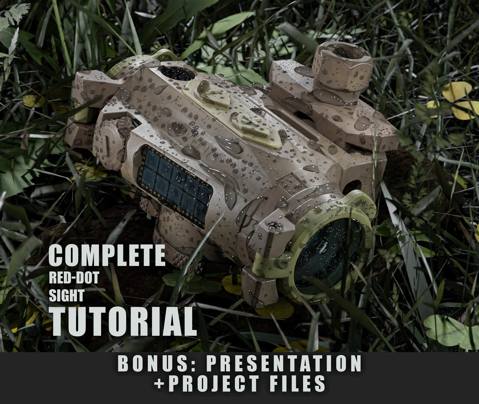 A 16-hour video tutorial covering the complete workflow for creating a game-ready red-dot sight. The course demonstrates a CAD-based pipeline starting with blockout in Plasticity, followed by high-poly modeling using Blender and ZBrush. It covers mesh optimization with PixyzSTUDIO and Blender, UV unwrapping with RizomUV, and baking in Marmoset Toolbag. The texturing phase is handled in Substance Painter, focusing on techniques for realistic finishes. The complete edition includes project files across all software used, featuring Blender scenes with completed meshes, Marmoset bake setups, Substance Painter projects, alphas, smart materials, and a final Blender render scene with camera setups and animations.