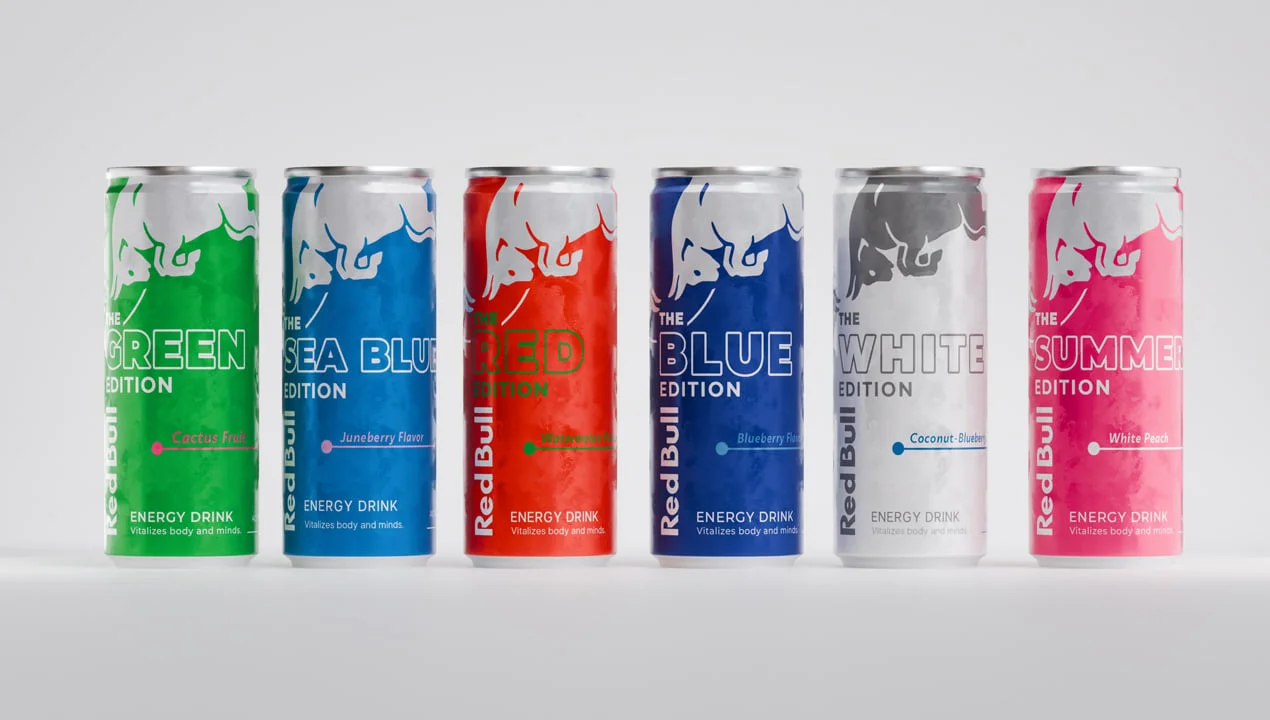 This asset provides a collection of label textures for energy drinks, featuring six specific flavor editions. The included textures cover Sea Blue (Juneberry), Green (Cactus Fruit), Red (Watermelon), Blue (Blueberry), White (Coconut & Blueberry), and Summer 2025 (White Peach). The package includes a ready-to-use Blender file containing six fully configured soda can models with the materials already applied. It is compatible with both EEVEE and Cycles render engines.