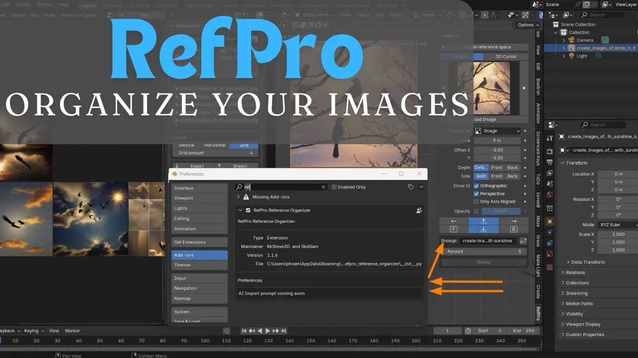 RefPro is an add-on that creates a customized workspace specifically designed for 2D and 3D reference modeling. It allows users to import individual images, specific selections, or entire folders of references directly into Blender. The tool provides formatting options to arrange these reference images into vertical, horizontal, or grid layouts with adjustable padding.