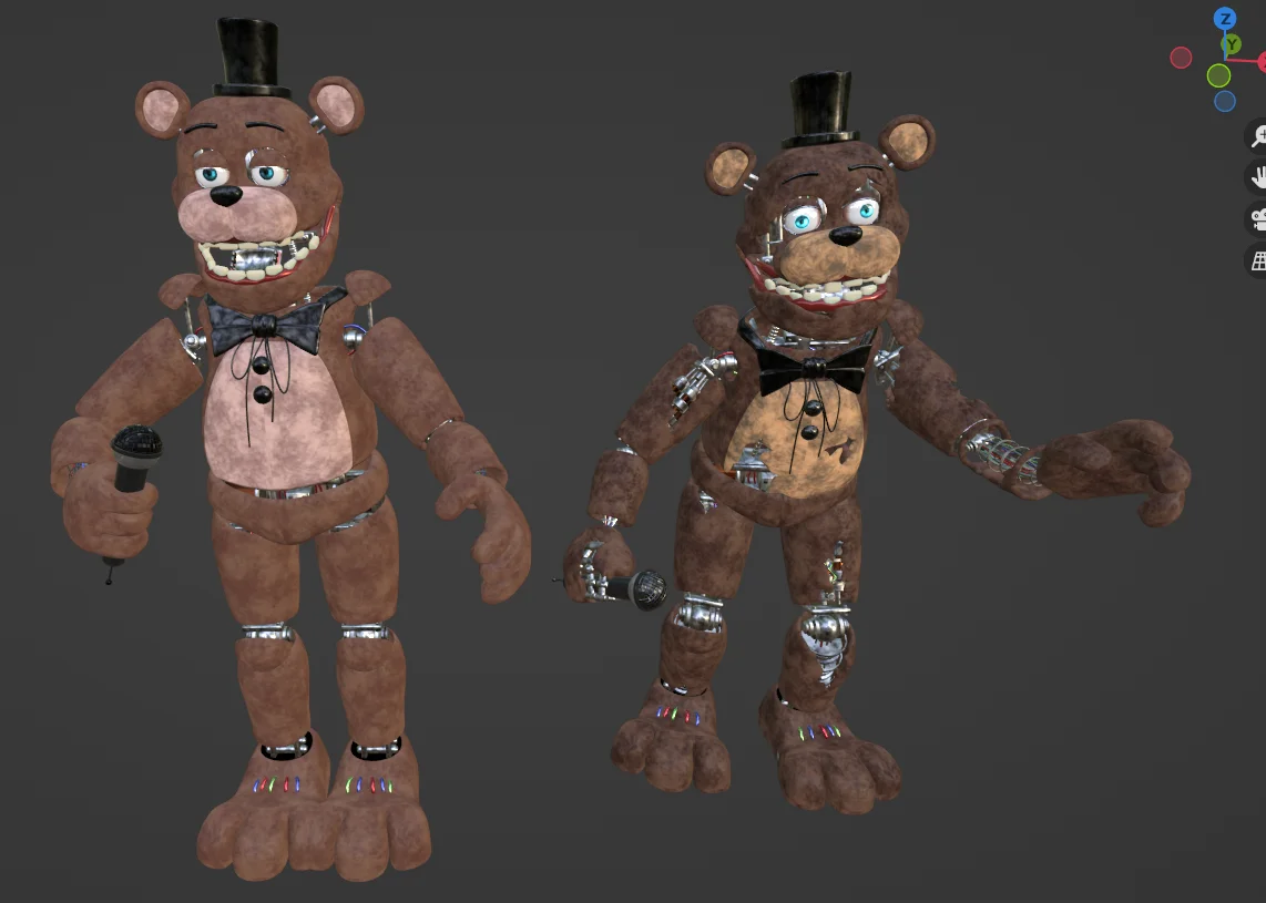This package contains two character models of Freddy, featuring both withered and unwithered variations. Both models include built-in Inverse Kinematics (IK) rigs to assist with animation and posing workflows.