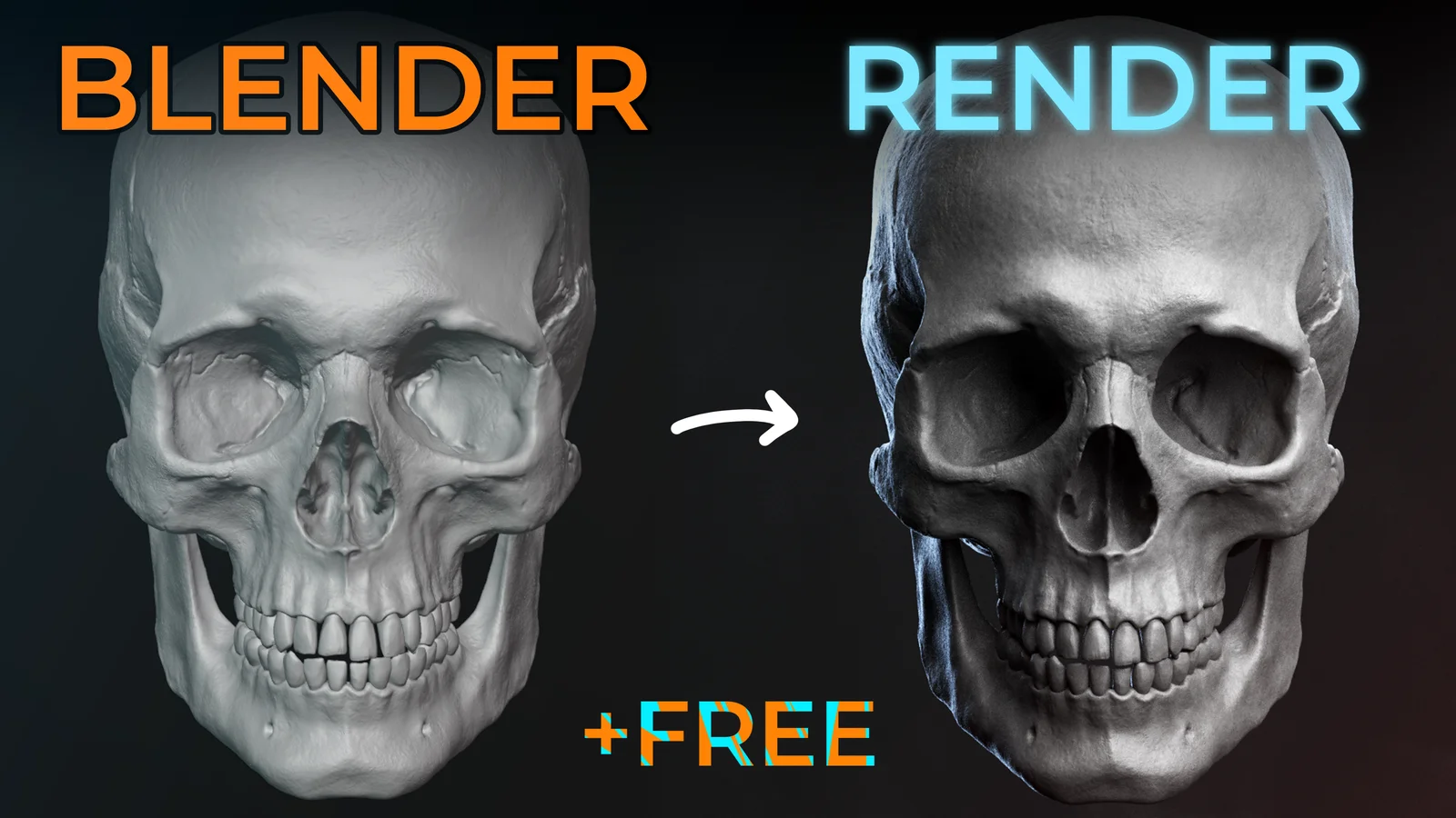 A pre-configured Blender render scene that includes lighting and a custom material setup. The package features a skull 3D model provided in both high-quality and decimated versions, ready for rendering.