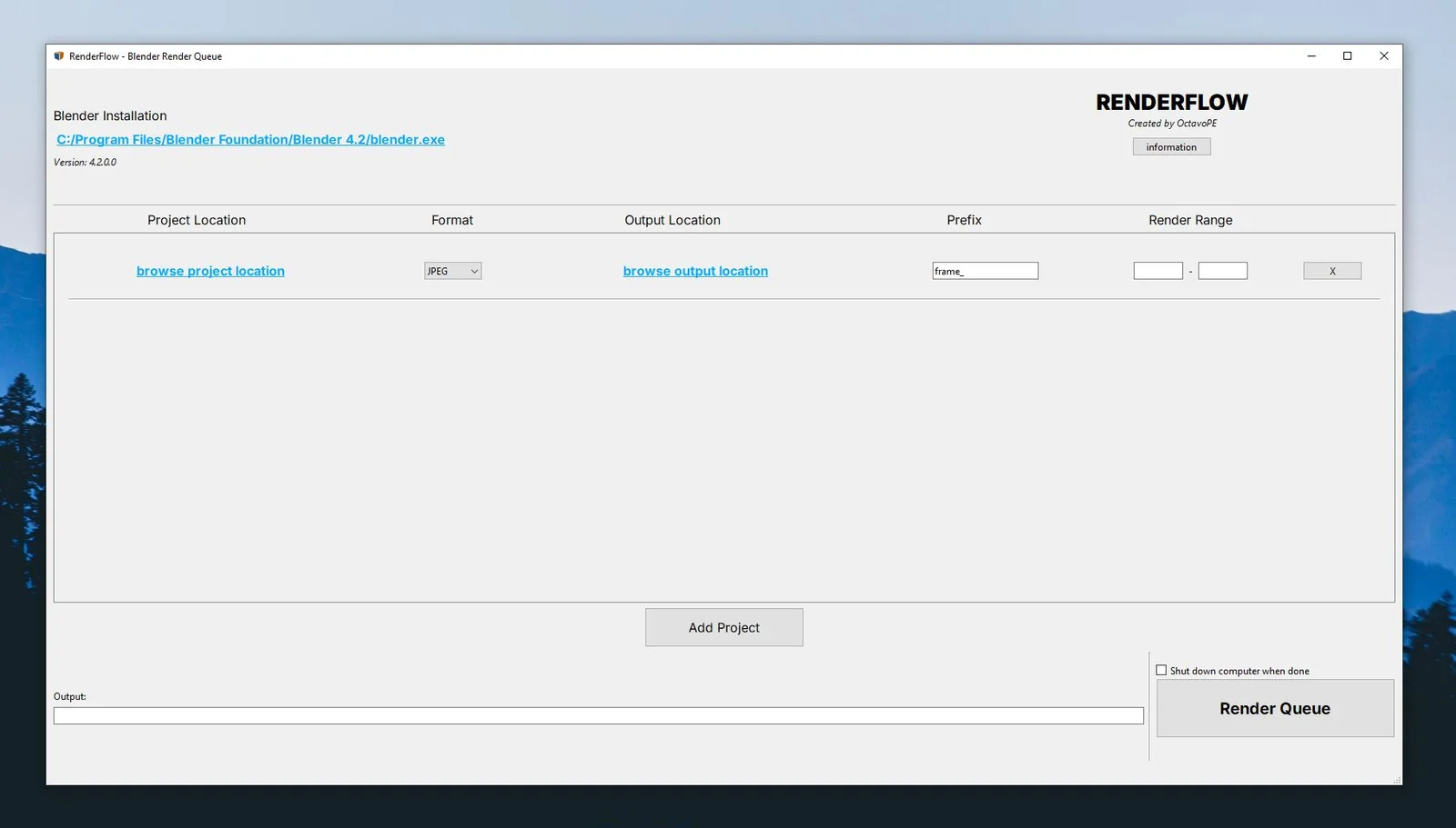 RenderFlow is a Windows-based application that processes a queue of Blender projects sequentially without requiring manual terminal commands. Users can assign their preferred executable, allowing compatibility with standard Blender releases, Goo Engine, and other custom forks. The interface allows users to add multiple projects, specify custom output directories, and define specific frame ranges for image sequence renders. It includes validation warnings for missing fields and an optional auto-shutdown feature that turns off the computer after the processing queue is complete.