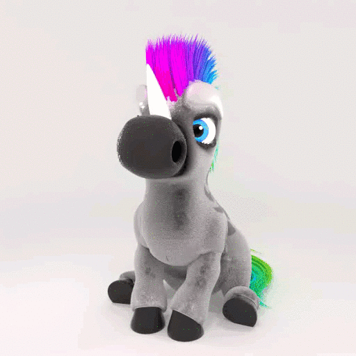 This rigged 3D unicorn character features a full-body and facial rig, including specific controls for nostril movement. The rig incorporates squash and stretch functionality alongside an inverse kinematics setup for the legs. The model includes complete UV mapping, textures, and four edited hair and fur maps configured with hair dynamics. It is designed with Cycles-based materials that balance realistic and stylized aesthetics. The download also includes a complete environmental setup, original lighting, and sample animations.