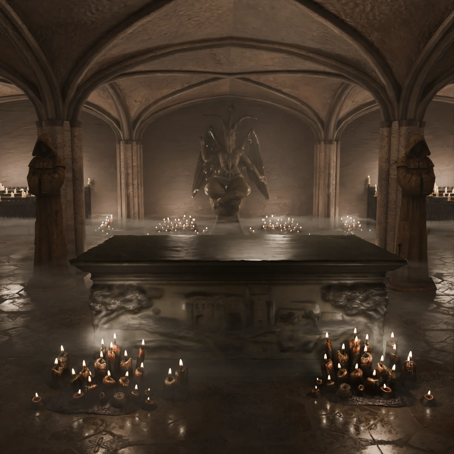 A pre-built ritual room environment for Blender. The provided scene includes a fully assembled interior space with various models and adjustable lighting. It is configured for rendering in both the Cycles and EEVEE engines.