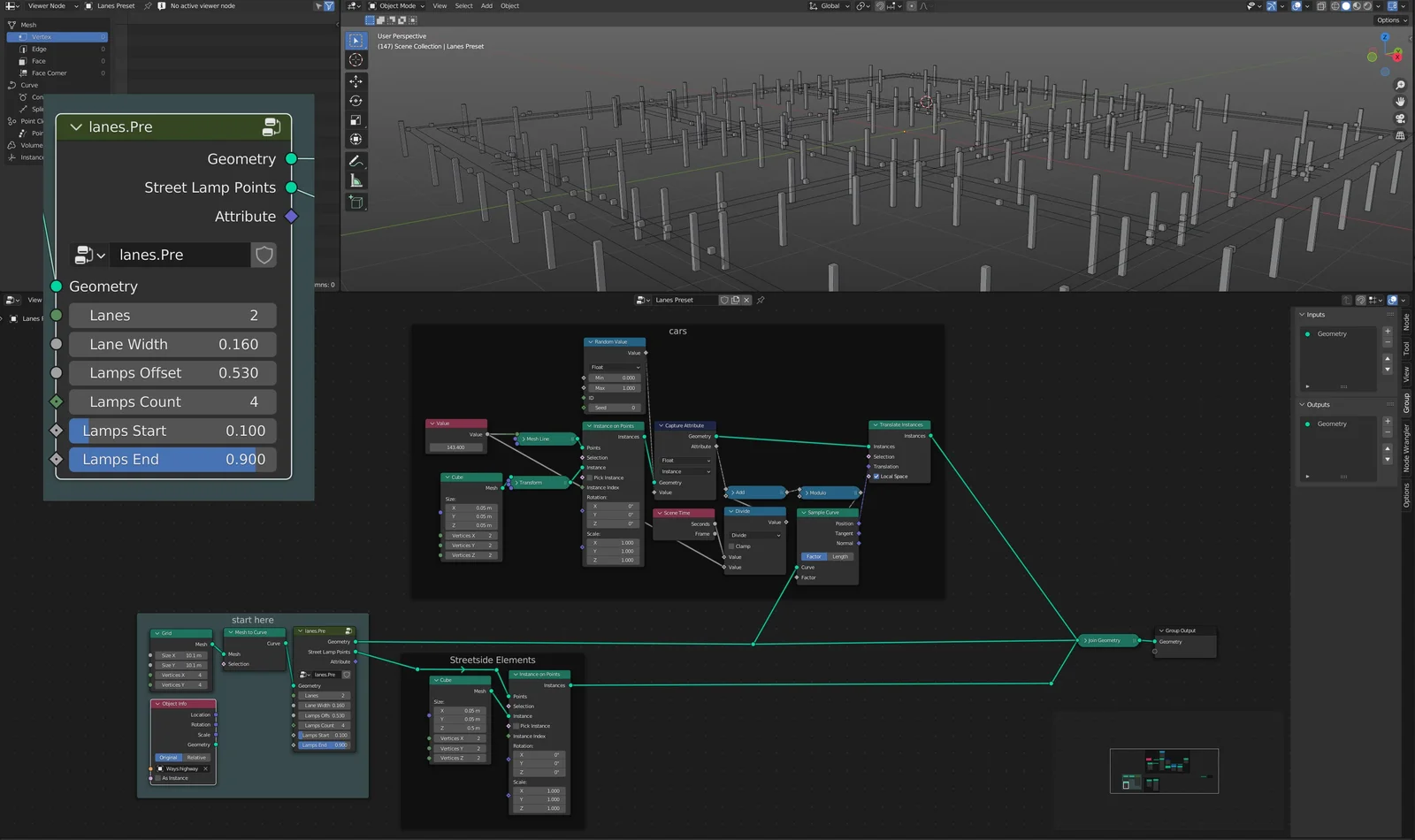 This Geometry Nodes setup generates procedural roads based on curve inputs. It is capable of creating between one and six lanes extending to the left and right of the original curve. The system automatically populates the generated road with moving cars and lampposts, and these instances can be replaced with custom geometry as needed.