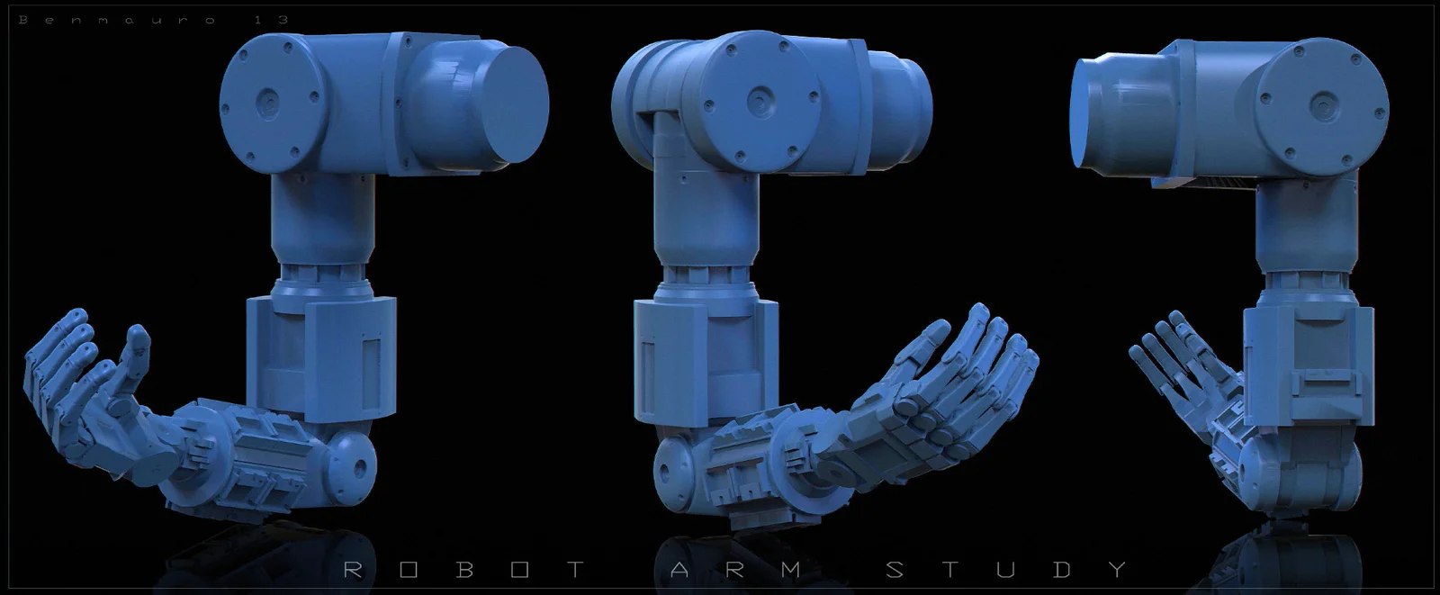 A 3D model of a mechanical robot arm intended for use as a kitbash element in conceptual design and hard-surface workflows. The geometry consists of a decimated mesh rather than clean quads. The package includes OBJ files of the standard arm and a simplified version without detailed forearm elements, along with the source ZBrush file containing separated parts.