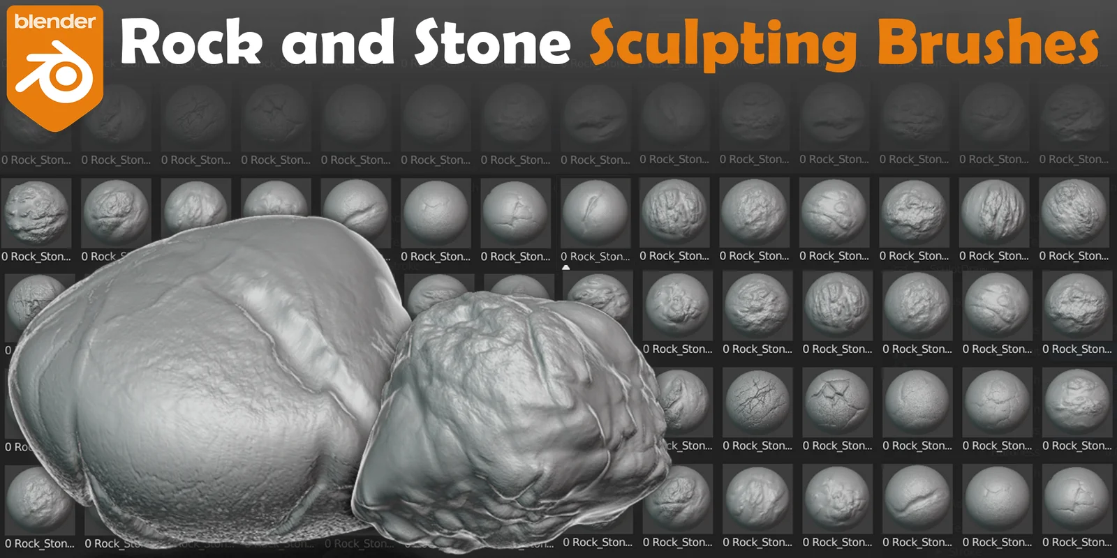 This package provides 55 customized sculpting brushes designed for creating rock and stone details in Blender's sculpt mode. Each brush includes custom textures, pre-configured settings, and individualized thumbnail previews for easy selection. The imported tools integrate directly into the standard Draw brushes tab and can be managed using standard brush strength and radius adjustments.