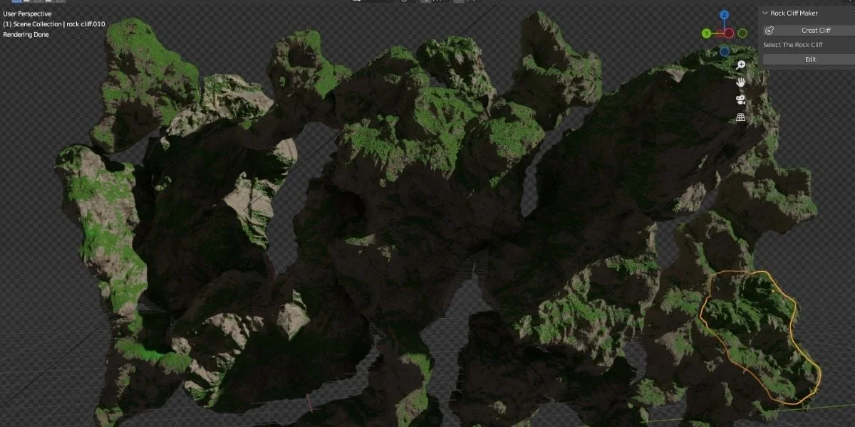 Rock Cliff Maker is an add-on for generating and modifying 3D cliff structures for natural environments. Operating from the 3D viewport's N-Panel, the tool allows users to spawn cliff meshes and enter a dedicated editing mode to tweak their shape via modifier settings. The add-on includes several built-in cliff styles, including variations with moss detailing.