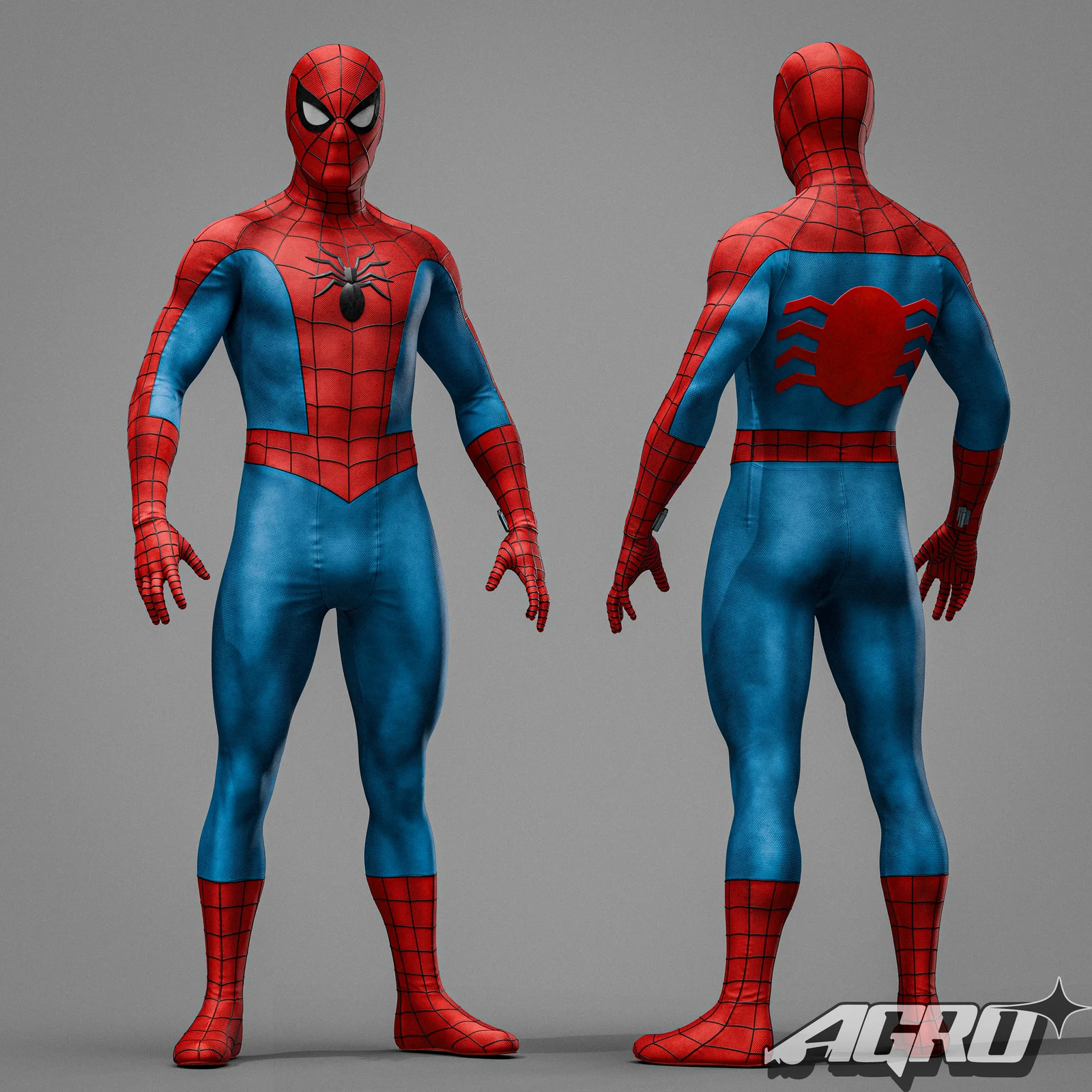 A rigged 3D character model of Spider-Man based on the classic artwork of John Romita Sr., adapted to feature a realistic, live-action visual style. The model incorporates detailing based on real-world sewing patterns. It includes 4K textures and handles a geometry of 180,000 polygons and 148,000 vertices. Files are provided in both .blend and .fbx formats.