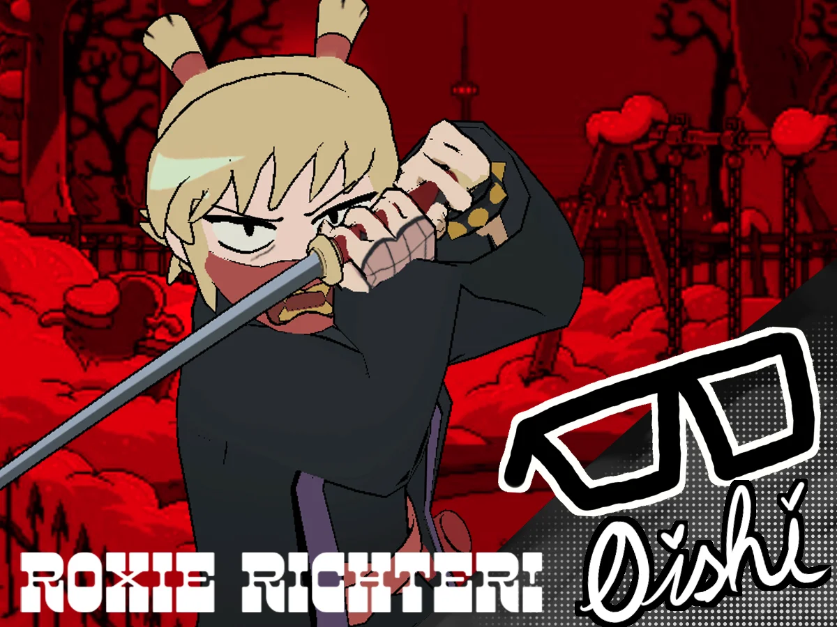 A 3D character model of Roxie Richter from the series Scott Pilgrim Takes Off. The product includes the character model along with her robe, katana, and mask accessories. It also comes with two alternate color palettes. The files are provided in FBX and Blend formats for use in Blender and other 3D software.