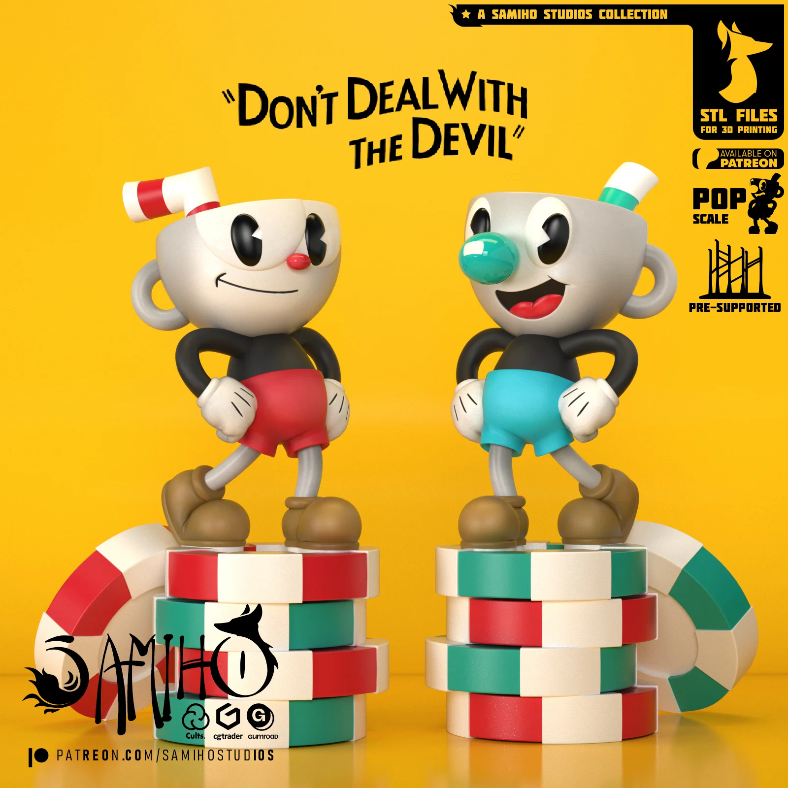 A set of STL files designed for 3D printing featuring Cuphead and Mugman. The pack includes 34 high-detailed split pieces along with 3 simplified pieces optimized specifically for FDM printers. It comes with step-by-step instructions and reference photos to assist with the printing and assembly process. Once printed, the figures stand approximately 18 centimeters tall.