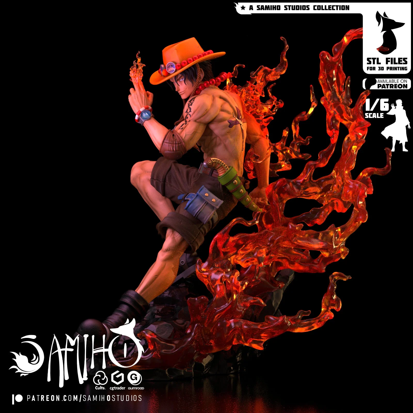 A highly detailed 3D printable figure model of Fire Fist Ace, provided as STL files. The model is separated into 25 pieces for resin printing, with the base, arms, head, and torso available as split components. A simplified six-piece design is also included specifically for FDM printers. The character's wrist accessory features a designed cavity that can be printed in clear resin and filled with ink to reveal internal details.