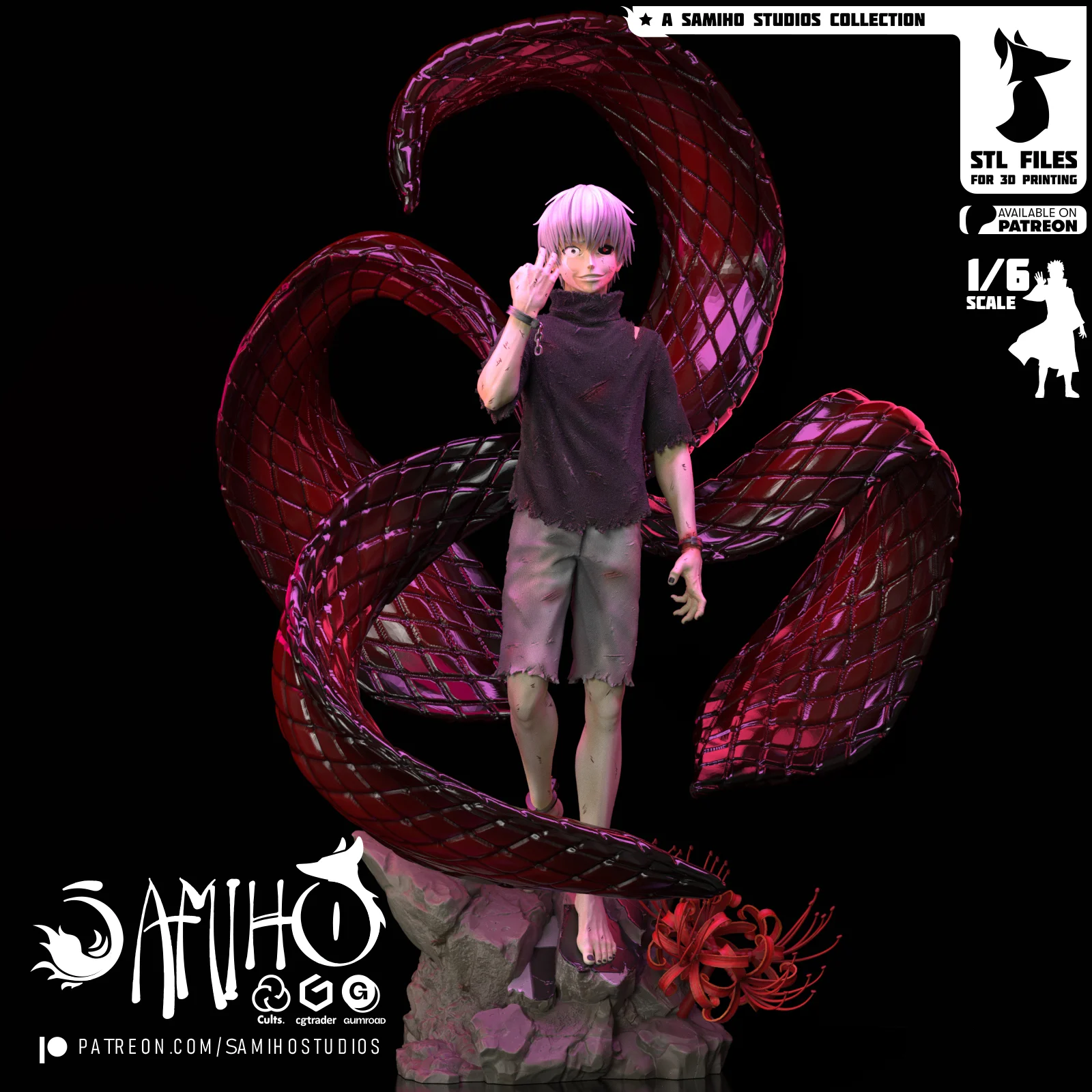 This product contains 3D printable STL files to assemble a Kaneki Ken character figure. The model is provided in two variations: a highly detailed version separated into 17 pieces, and a simplified version optimized for FDM printers consisting of 13 pieces. Assembly components include an alternate two-piece head with separated forehead hair and an optional unified base. The creator includes specific hollowing recommendations for the figure's appendages to ensure proper balance after assembly. Reference photos and instructions are included, and the default assembled figure stands at a height of 41.5 centimeters.