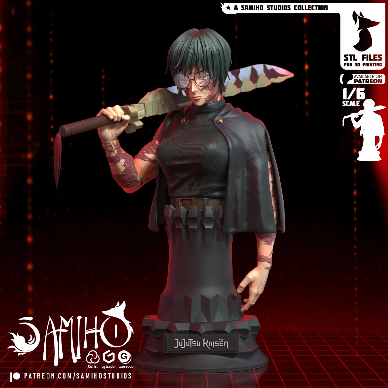 A 3D printable 1/6 scale statue bust of Maki Zenin, provided in STL format. The model includes a highly detailed version split into 21 pieces designed for resin printing, as well as a simplified 13-piece assembly optimized for FDM printers. At its default scale, the assembled statue measures 22 centimeters in height. The package includes assembly instructions and reference photos.
