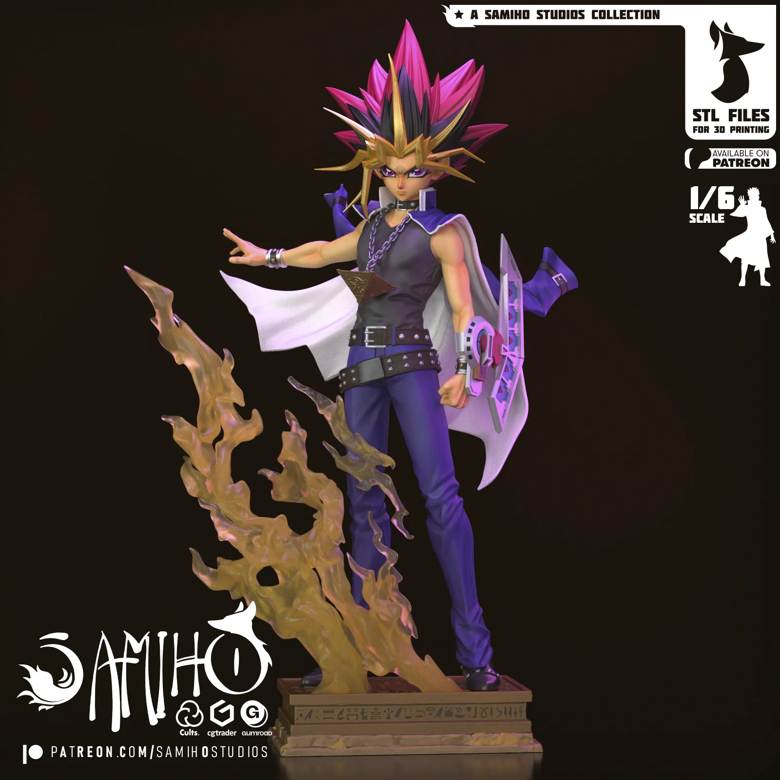 A set of format-agnostic 3D model files intended for 3D printing a statue of Yami Yugi. The package includes 38 highly detailed pieces alongside a simplified 6-piece design optimized for FDM printers. The sequence features modular customization options, including an optional jacket, a torso version without attachment holes, an alternate base without smoke effects, and a secondary version with the pants merged into the belt. At default scale, the assembled model measures 27.5 centimeters in height.
