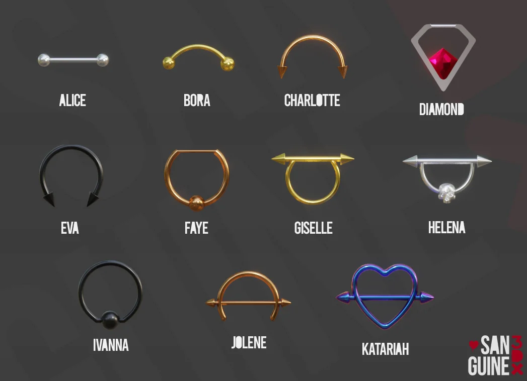 A collection of eleven piercing models provided in a Blender file. The set includes five different finishes. The piercing tips feature shapekeys, allowing users to morph the geometry between round and spiked shapes.