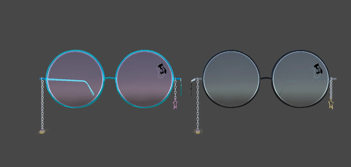 A 3D model of circular glasses featuring star and Saturn adornments, designed for use with character models. The standard accessory includes dangling chains and adjustable side pieces to help fit the eyewear to different character head shapes.