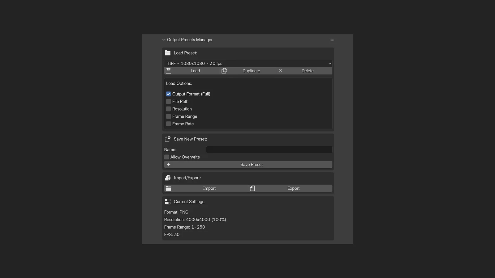 This add-on provides a preset system for Blender's render output settings, accessible directly from the Output Properties panel. It allows users to save, load, import, and export entire render configurations. Users can selectively apply specific parameters from a preset using checkboxes, including file path, resolution, frame range, frame rate, and output format settings such as PNG, JPEG, EXR, and FFmpeg video compression. The tool includes an automatic backup feature that saves presets to a JSON file, enabling synchronization across different Blender files and sharing with teammates.