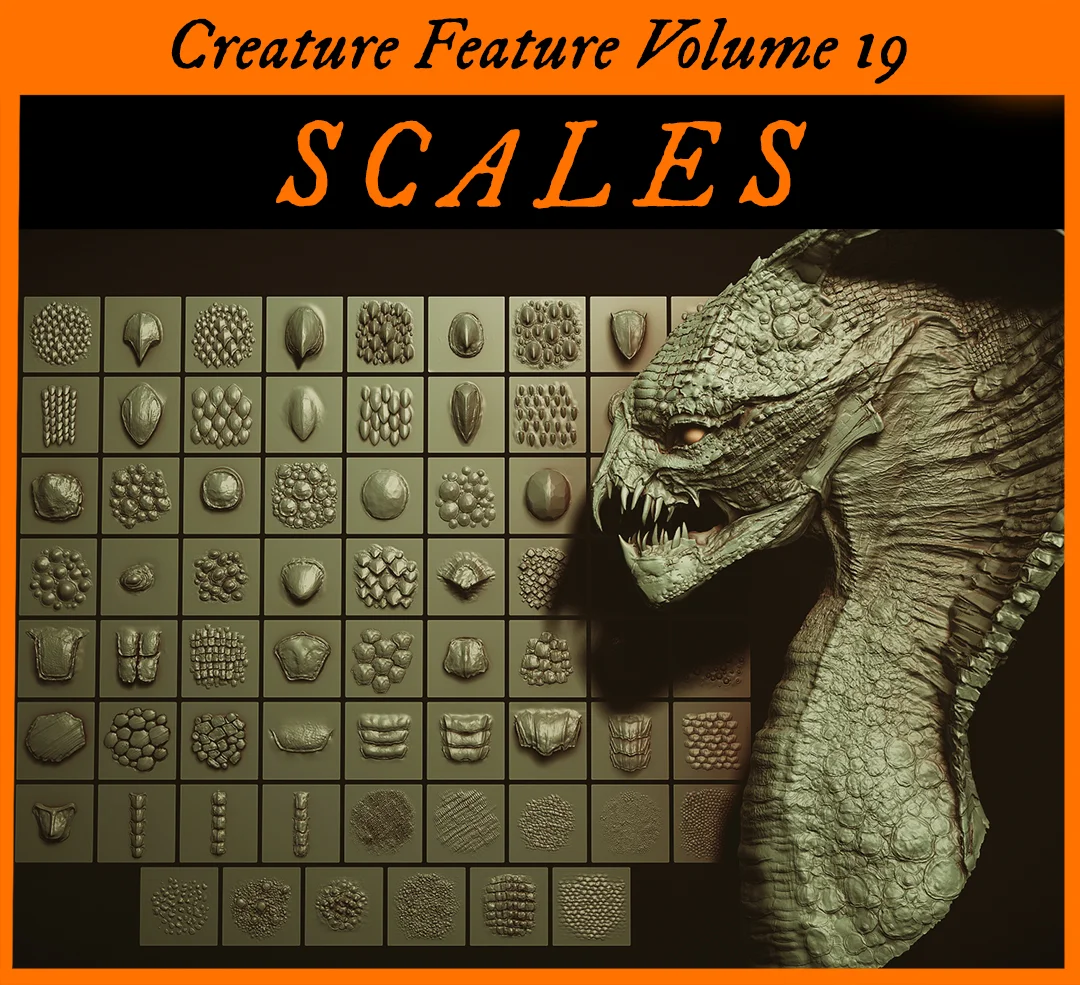 A collection of 69 high-detail scale models designed for detailing creature skins. The set focuses on reptilian, dragon, snake, and other fantastical creature designs. It includes both single scale and clustered scale variations.