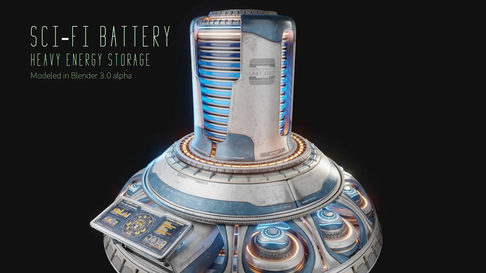 A high-poly 3D model of a sci-fi heavy battery. The geometry is subdiv-ready and features clean topology. The native Blender file includes Cycles materials, embedded CC0 textures, and a complete lighting setup. An additional blend file is included that provides an animated user interface for the control console.