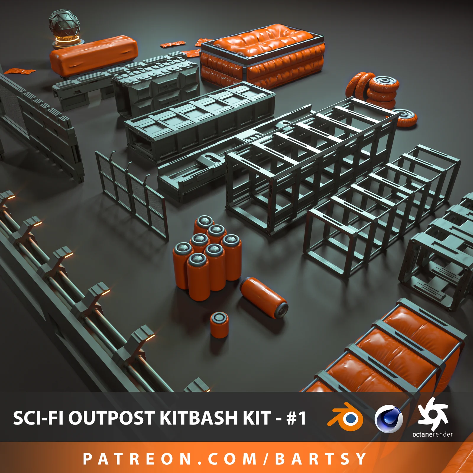 A kitbash collection of 3D models designed for constructing sci-fi outposts. The models are provided without detailed UV mapping and are intended to be textured using cubic projection methods. The package includes native Blender files alongside OBJ and Cinema 4D formats.