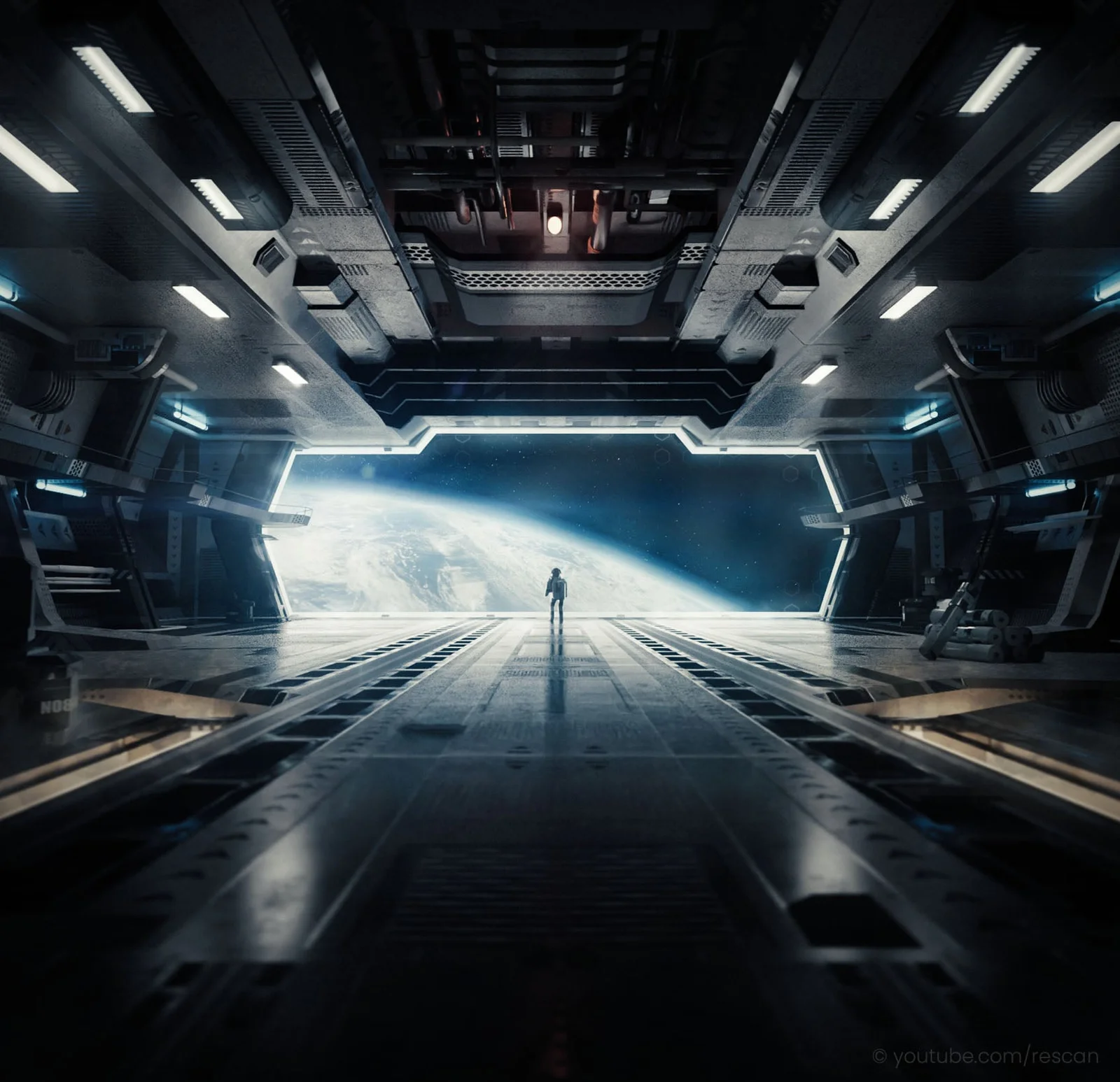 This is a completed Blender scene file containing a sci-fi ship hangar environment, originally created as part of a tutorial. The project file includes the 3D layout, models, and composition of the artwork. Texture files are not packed directly into the download; links to the required textures are provided within the file for separate downloading.