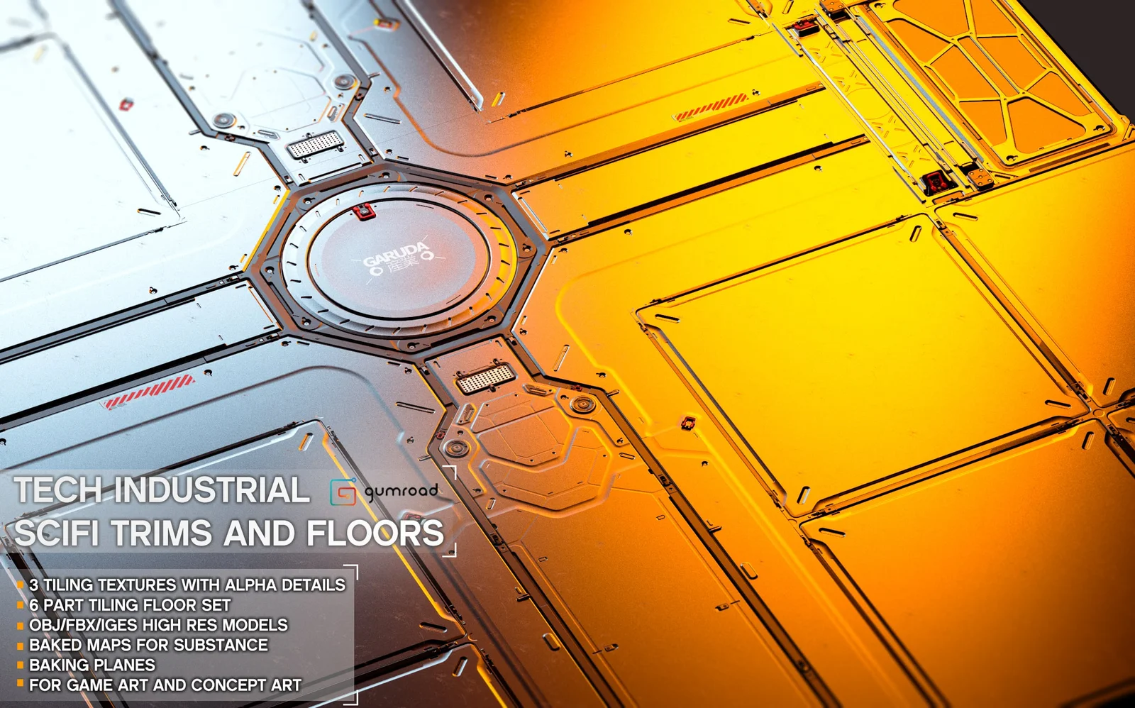 A collection of tech-industrial sci-fi models and trim sheets designed for game art and concept design environments. The set supports traditional tiling texture workflows as well as dual UV channel and floater techniques.