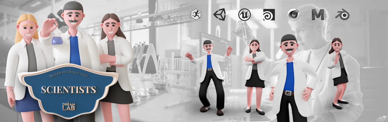 This asset pack includes two stylized, low-poly 3D character models of a man and a woman dressed as scientists. The characters are fully rigged and compatible with Mixamo, allowing for quick animation application. The models are subdivision-ready and utilize a single texture map, making it straightforward to customize the colors of their clothing and skin. The pack provides native Blender project files, FBX formats, and 12 pre-made animations.