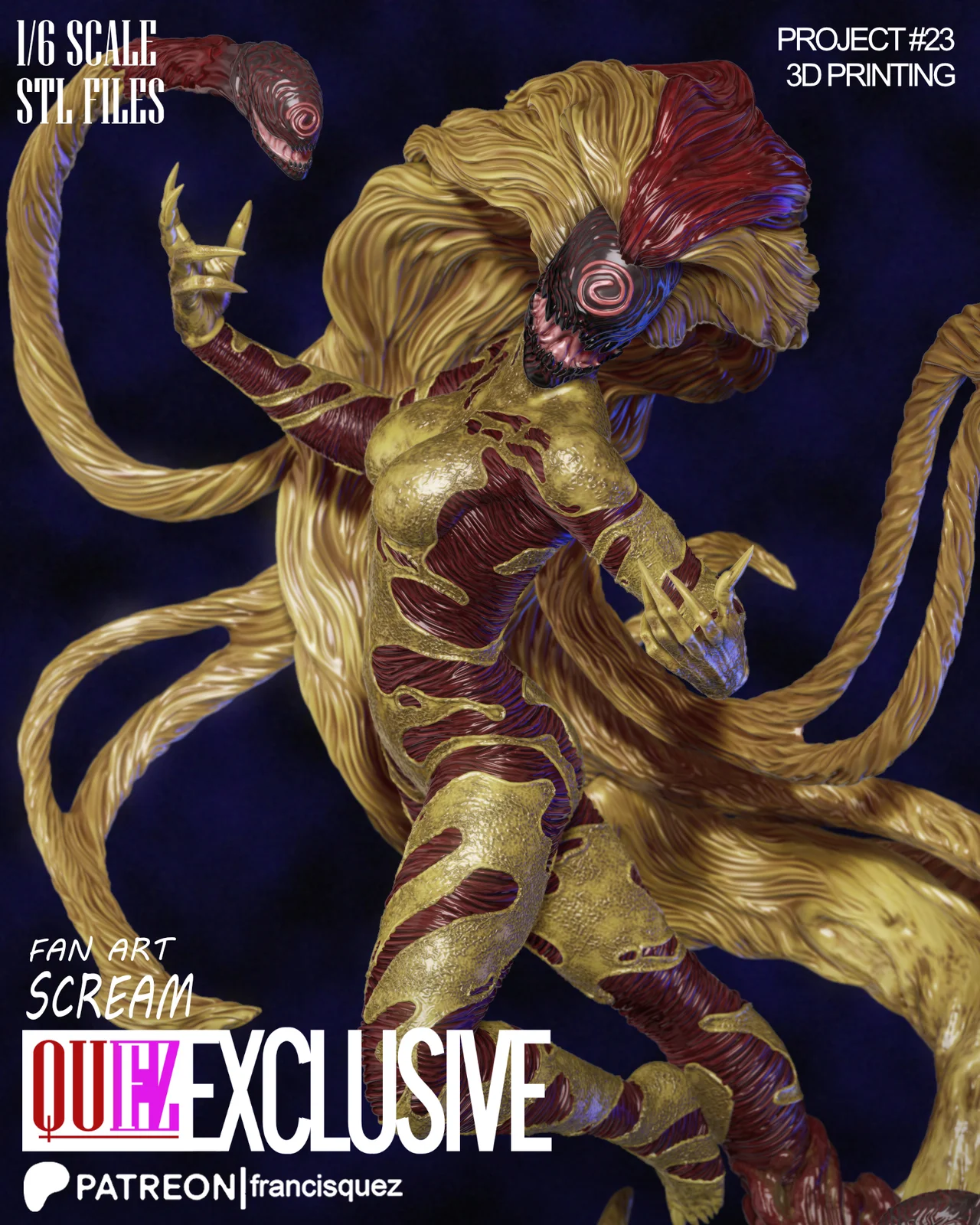 This is a 1/6 scale 3D printable fan art model based on the Scream character. The model is provided in STL format and is designed to be printed and painted. At its default 1/6 scale, the assembled model stands 390mm (15.4 inches) tall.
