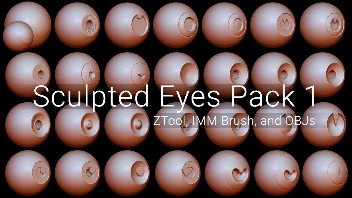 This collection provides 30 3D meshes of sculpted eyes, featuring 25 unique designs alongside variants and two cornea/sclera outer meshes. The models cover a range of aesthetic styles, from highly stylized shapes to classical and realistic forms. Scaled to the approximate size of an adult human eye, the meshes were created using poly-modeling and hand-sculpting techniques, with polygroups retained where practical for easier selection and material assignment.