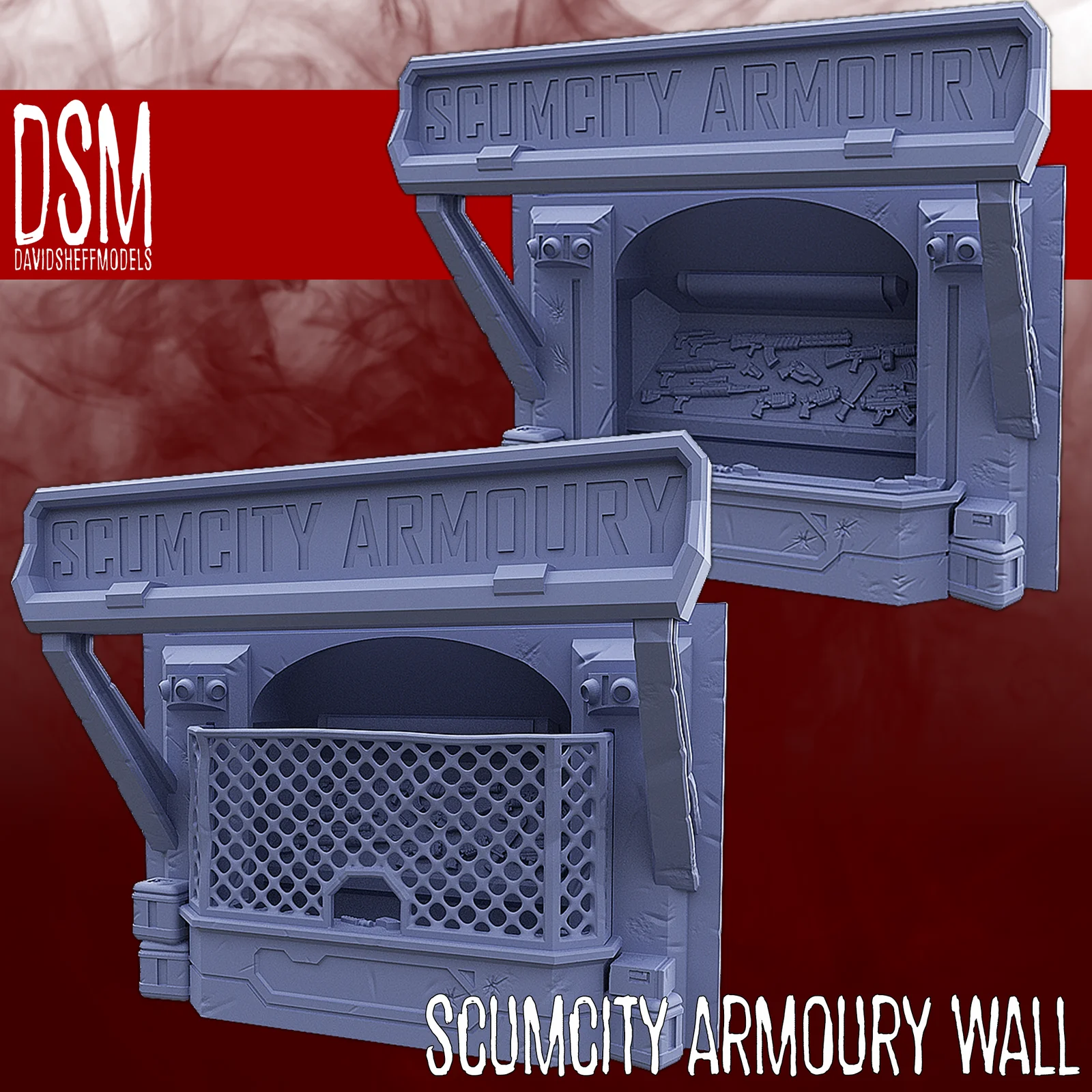 A 3D printable armoury wall terrain piece designed for FDM printers without the need for supports. The model is scaled for 28mm Heroic to 40mm miniatures and comes separated into three distinct parts: a wall, a security mesh, and a sign. The files are provided in STL format and are oriented for optimal printing on beds of 180mm x 180mm or larger. Note that this component is designed to connect with the larger ScumCity Terrain Set or Expansion Set.