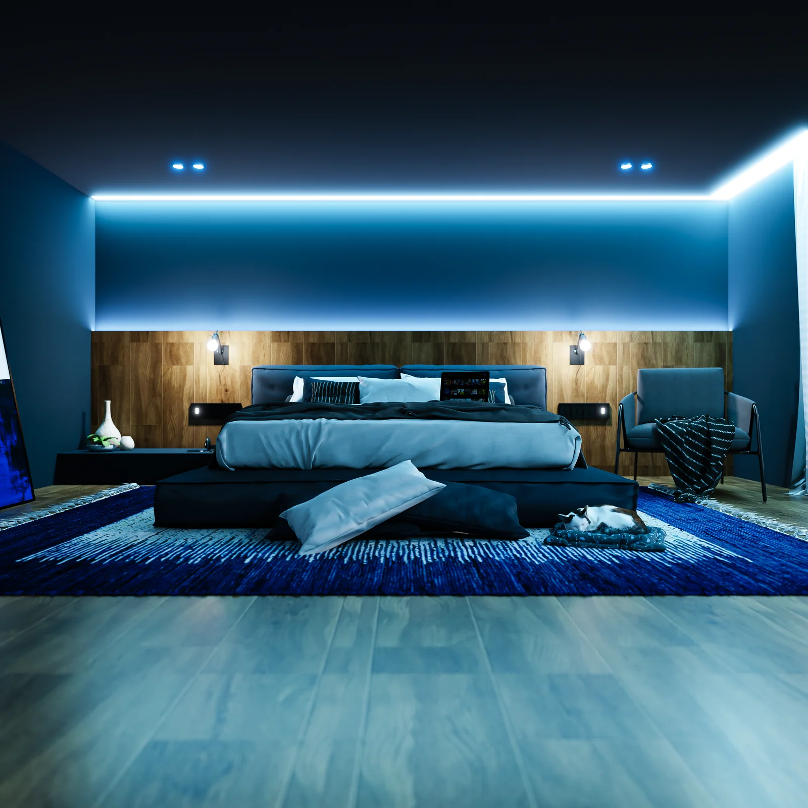 A pre-made 3D scene of a blue bedroom environment designed for use in Blender. The interior setup is configured for rendering in both the Eevee and Cycles engines.