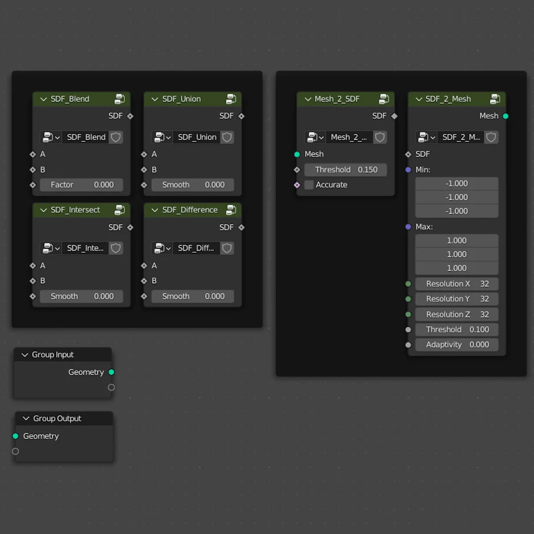 A collection of Geometry Nodes designed for working with Signed Distance Fields (SDF) in Blender. The project file includes node groups to convert standard polygonal meshes into SDF volumes and back into meshes. It also provides mathematical operations for combining SDFs, including blend, union, intersect, and difference nodes.