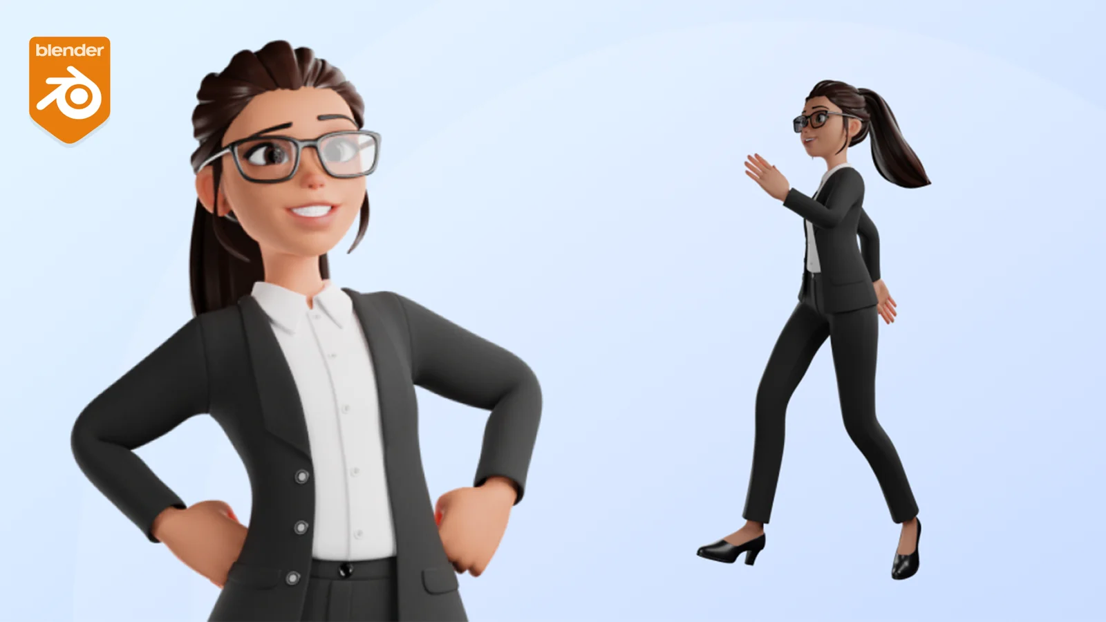 A fully rigged, low-poly businesswoman character model designed for animation, rendering, and real-time engines. The asset features an advanced face and body rig, clean topology, and fully UV-unwrapped PBR materials. It includes 27 premade poses accessible directly through Blender's Action Library.
