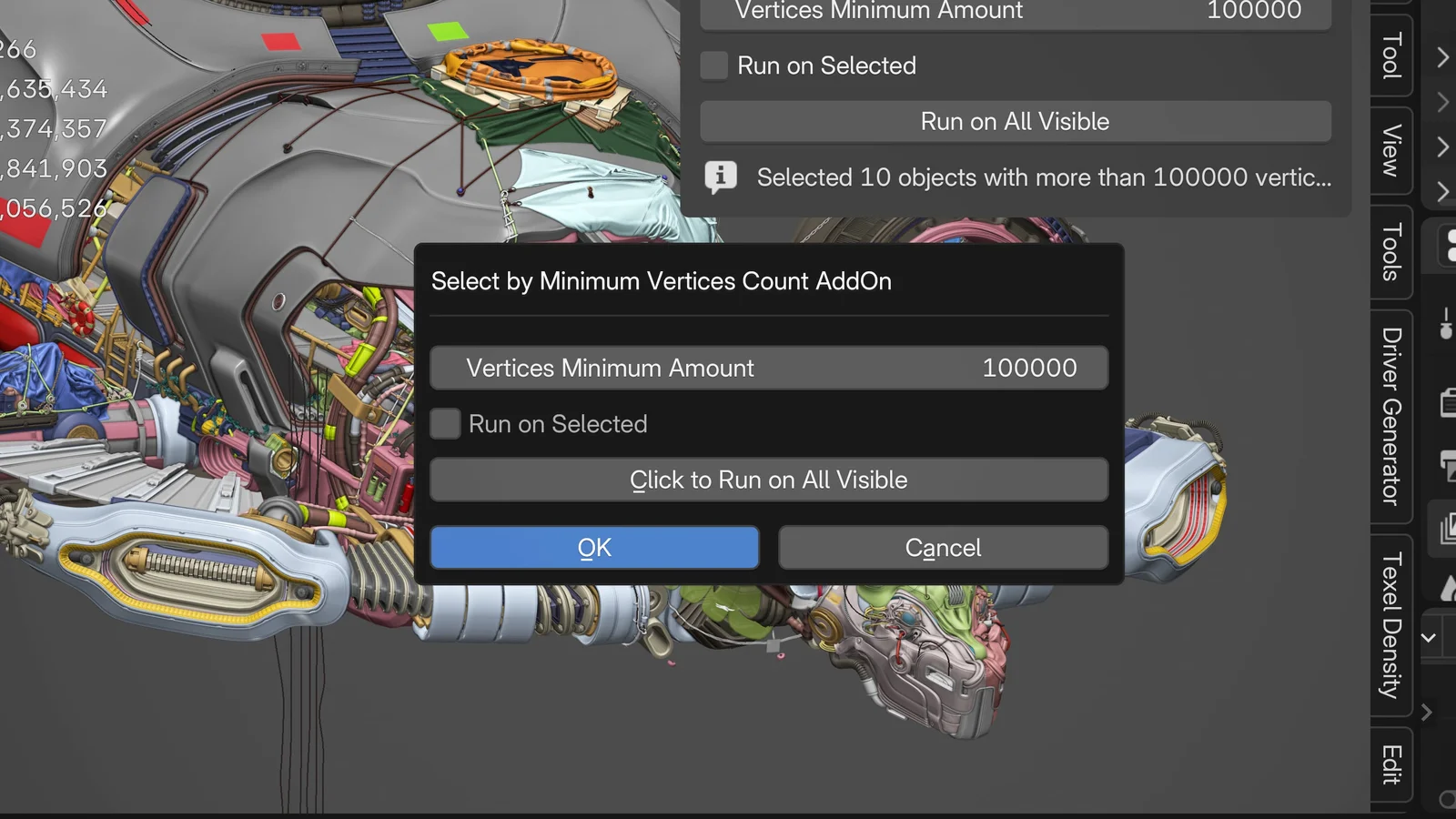 The tool evaluates the final vertex count, including any active modifiers such as Subdivision Surface. It works with standard meshes, curves, and objects generated via Geometry Nodes. You can choose to run the selection process on your current selection or across all visible objects in the scene. The settings are accessible from the side panel or through an invocation popup.