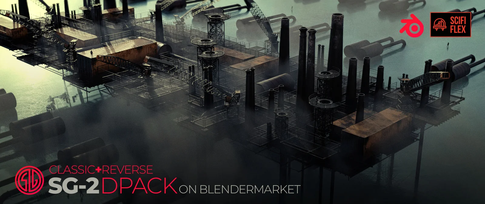 SG-2 Dpack is a mesh collection designed specifically for use with the Simple SciFi and SciFi Flex addons. It provides a library of instanced geometry components that can be distributed across surfaces to quickly generate sci-fi, fantasy, and futuristic environments. The included meshes are optimized for creating distant cityscapes, complex spaceship hull details, and mechanical surfaces.