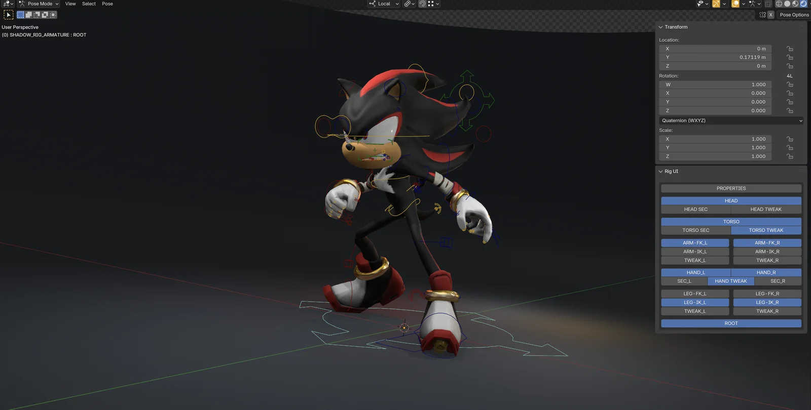 A fully rigged, fan-made 3D character model of Shadow designed for Blender 4.0 and above. The character was sculpted externally and retopologized, textured, and rigged within Blender. The rig includes a custom user interface (RigUI) and features body controls, IK/FK snapping operators, and IK parent switching properties. The facial setup includes a shrinkwrap-based universal mouth mechanism, alongside master controls for the character's hair and quills.