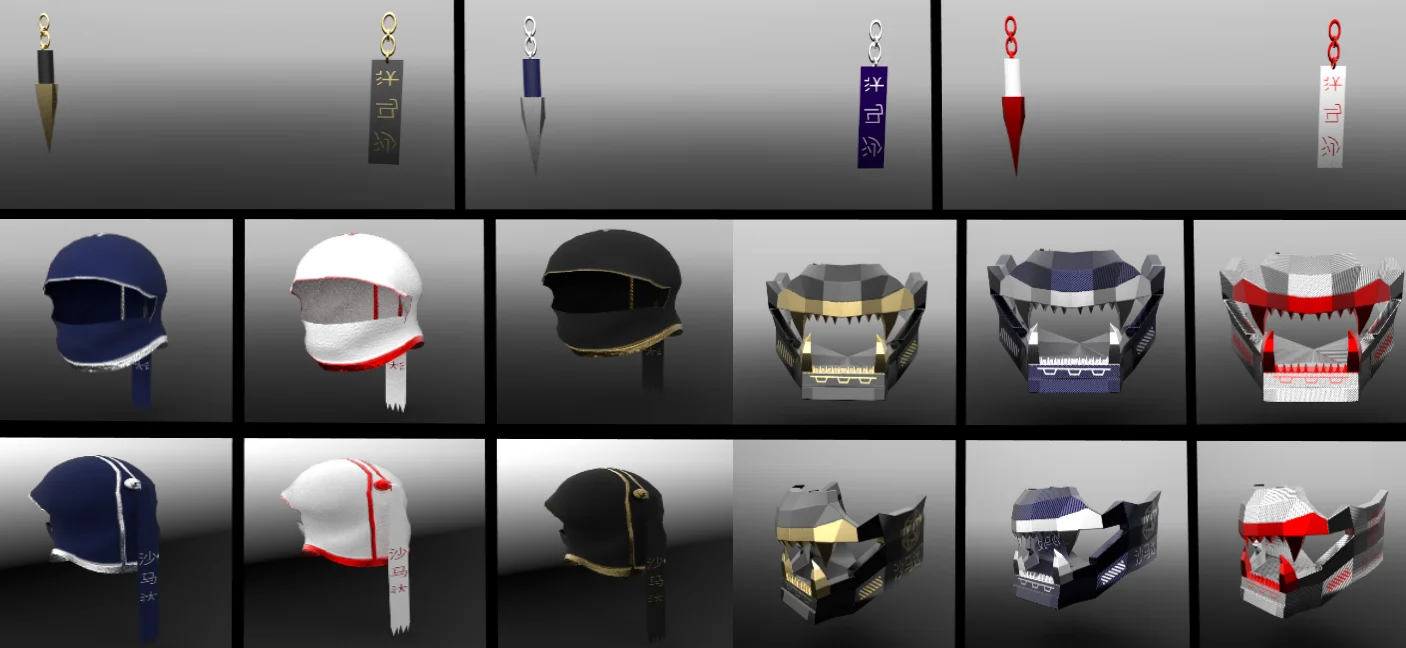 The Shamada Bundle includes three rigged 3D character accessories: the Shamada Hood, Shamada Earrings, and Shamada Oni Mask. The hood is a low-poly model at 900 faces with a single material. The earrings feature two materials and consist of 4,500 faces, while the oni mask has one material and is 1,400 faces. All items are provided as Blender files and include their respective Substance Painter files for texture customization.