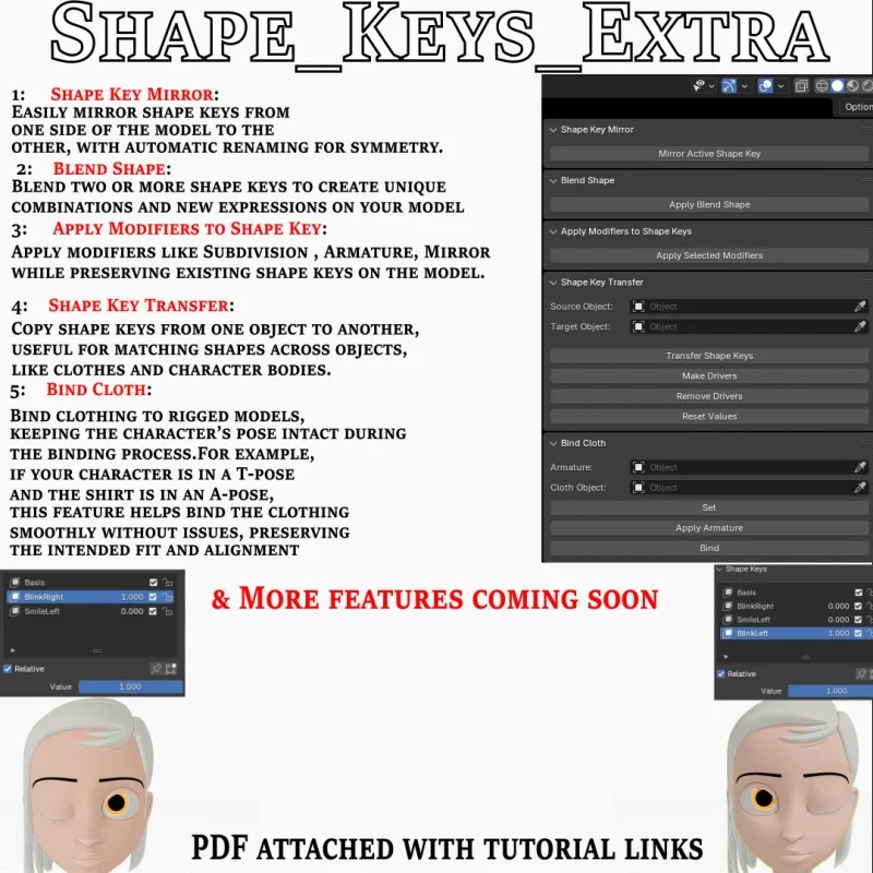 Shape Keys Extra provides a suite of tools for managing and manipulating shape keys in Blender. Users can mirror shape keys across a model for perfect symmetry or blend multiple keys together to generate new custom shapes and expressions. The toolset allows you to apply modifiers, such as subdivision or armature, without destroying existing shape key data. Additionally, it includes a transfer feature to copy shape keys between different objects, and a bind cloth tool specifically designed to attach garments modeled in alternate poses, such as mapping an A-pose shirt onto a T-pose character.