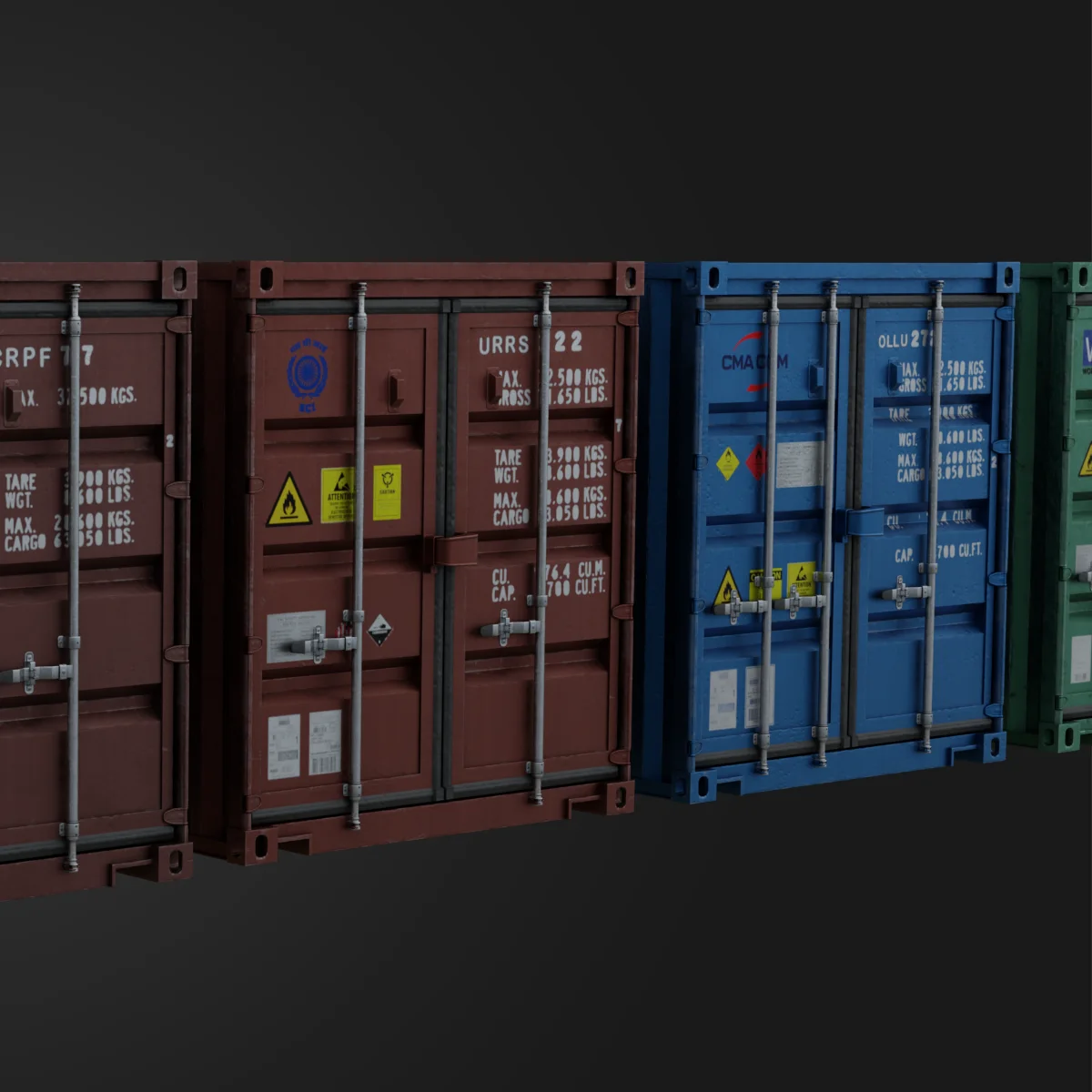 A collection of 20-foot and 40-foot shipping container 3D models. The set includes two variants for each size, providing options for industrial, port, or urban environments. All stickers and decals are baked directly into the textures, which are provided at 4K resolution alongside 32-bit normal maps. The models are supplied in standard FBX and OBJ formats.