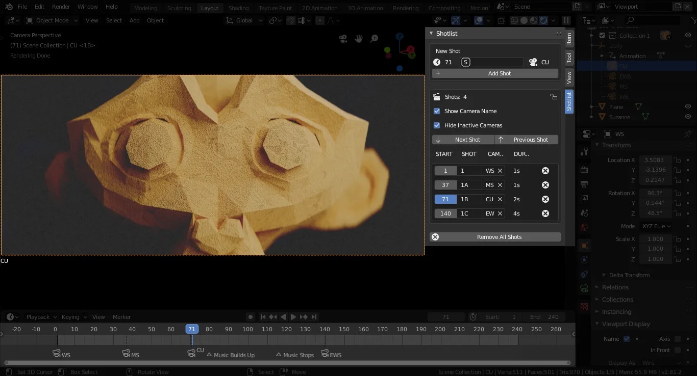 Shotlist is an add-on that simplifies the creation, management, and navigation of camera shots within Blender. It provides a centralized interface for adding, renaming, and removing shots, as well as jumping between specific cameras in a sequence. Users can swap a shot's assigned camera at any time, track shot durations, and lock shots to prevent accidental edits. Additional viewport features include the ability to automatically hide inactive cameras to reduce clutter and permanently display the active camera's name in both the Camera View and the 3D Viewport.