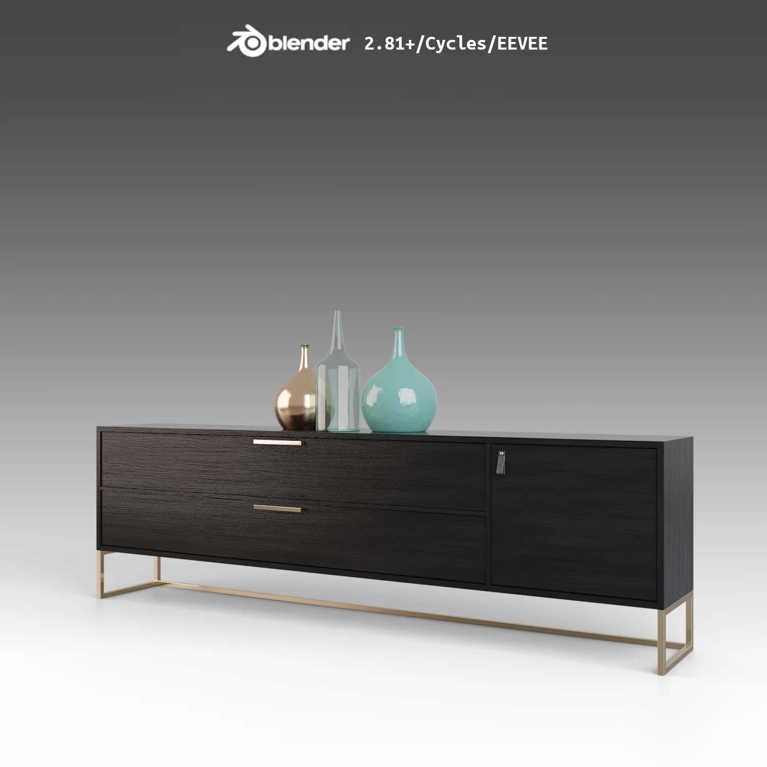A 3D model of a wooden sideboard featuring decorative vases, designed for use in Blender. The asset includes a complete material setup with all necessary textures and shaders configured for the Cycles render engine. A lighting setup is also provided within the scene for immediate rendering.