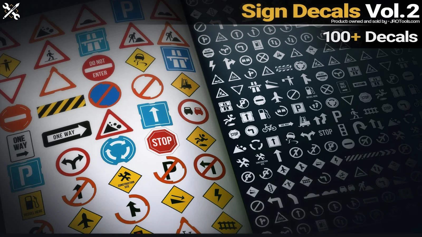 This texture pack provides a collection of 100 sign decals and alphas designed for adding surface details to 3D environments and hard-surface models. The assets are supplied as 2048x2048 transparent PNG images and corresponding PNG alpha maps, which can be mapped to 3D surfaces to drive color, height, and roughness variations. The package also includes the original editable SVG vector files, allowing users to modify the base shapes, adjust colors, and export at custom resolutions using vector editing software before bringing the updated assets into their 3D workflow.