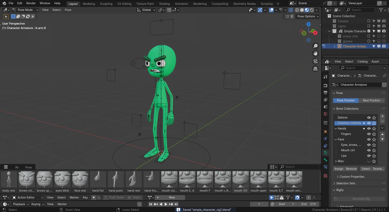 The updated character rig includes a facial rig, bone collections, and an included pose library. The older character rig does not include a facial rig, but allows for facial expressions by swapping the included face texture.